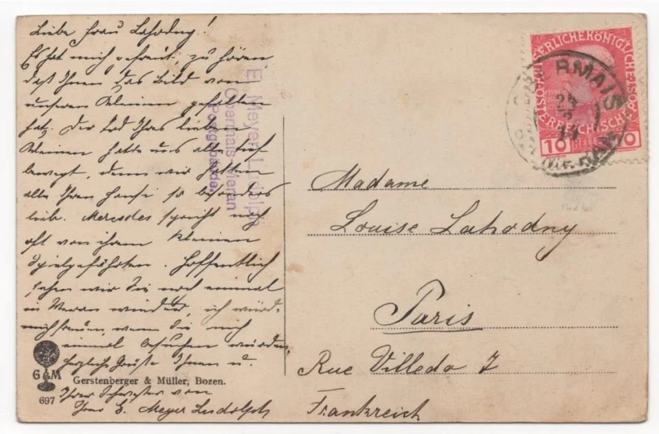 Emmy hat uns am 26. November 2022 gefunden. Es war ein Samstagnachmittag und ein paar Leutchen hatten sich zum Workshop “Gemeinsam in alten Fotos lesen" getroffen. Von den Postkarten, die die Teilnehmer*innen mitgebracht hatten, fielen viele auf und gingen wieder unter. Dann: Eine Ansichtskarte von St. Leonhard, 1914 verschickt an eine Madame Louise Lahodny in Paris. Eine Madame in Paris... das schien interessant! Aber da sich bei der Eingabe des Namens auf Google nichts rührte, verflog diese meine erste Spannung ziemlich bald.